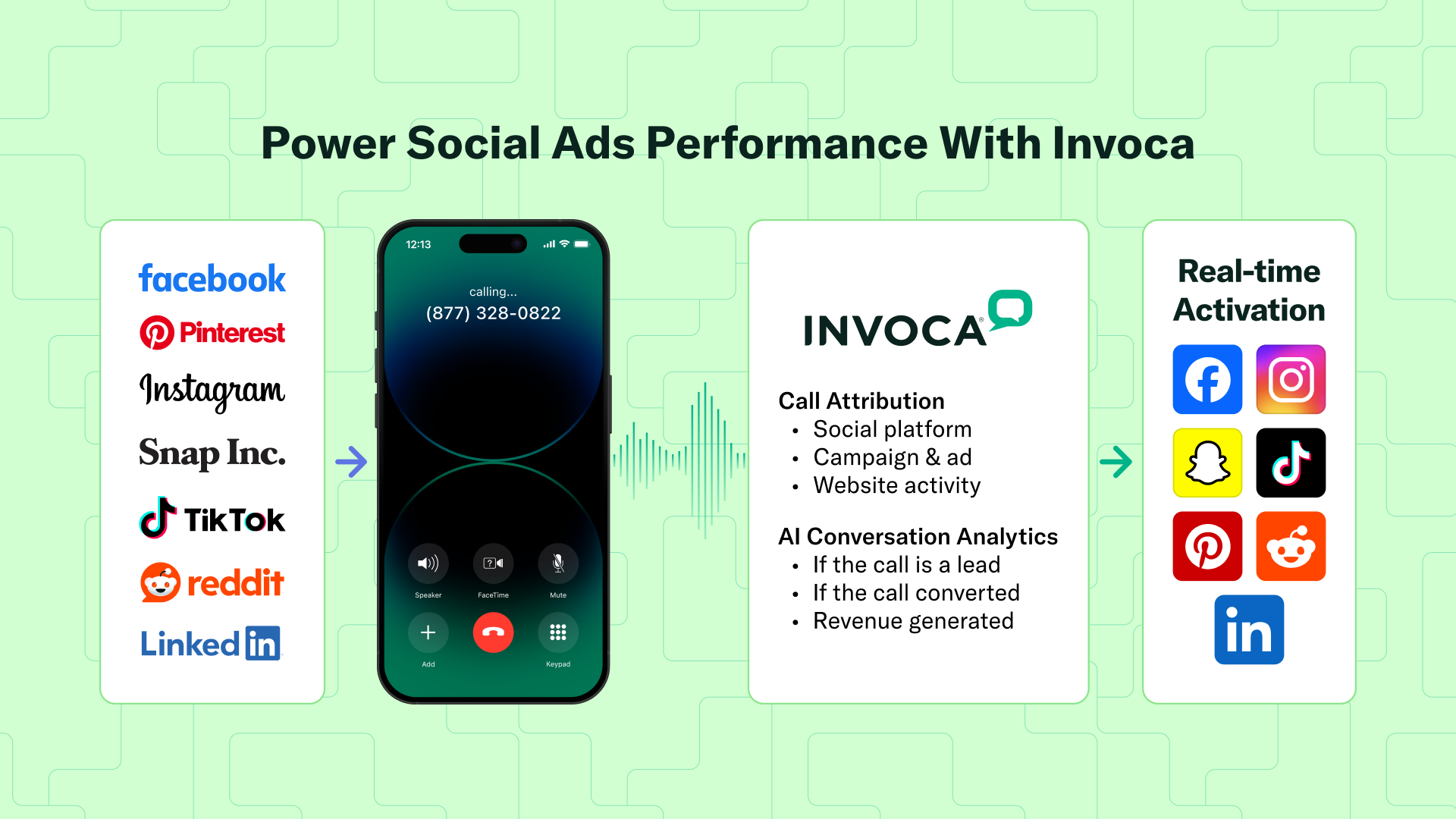 Invoca solves this challenge by using AI to capture first-party data from conversations to detect if a call is a lead and if it resulted in a conversion, attributing that call intent and outcome data to the social ad platform, campaign, and ad that drove it. No-code integrations with Facebook, Instagram, TikTok, LinkedIn, Reddit, Snapchat, and Pinterest make it simple to use that data to maximize your social media advertising ROAS and revenue and prove your impact on the business