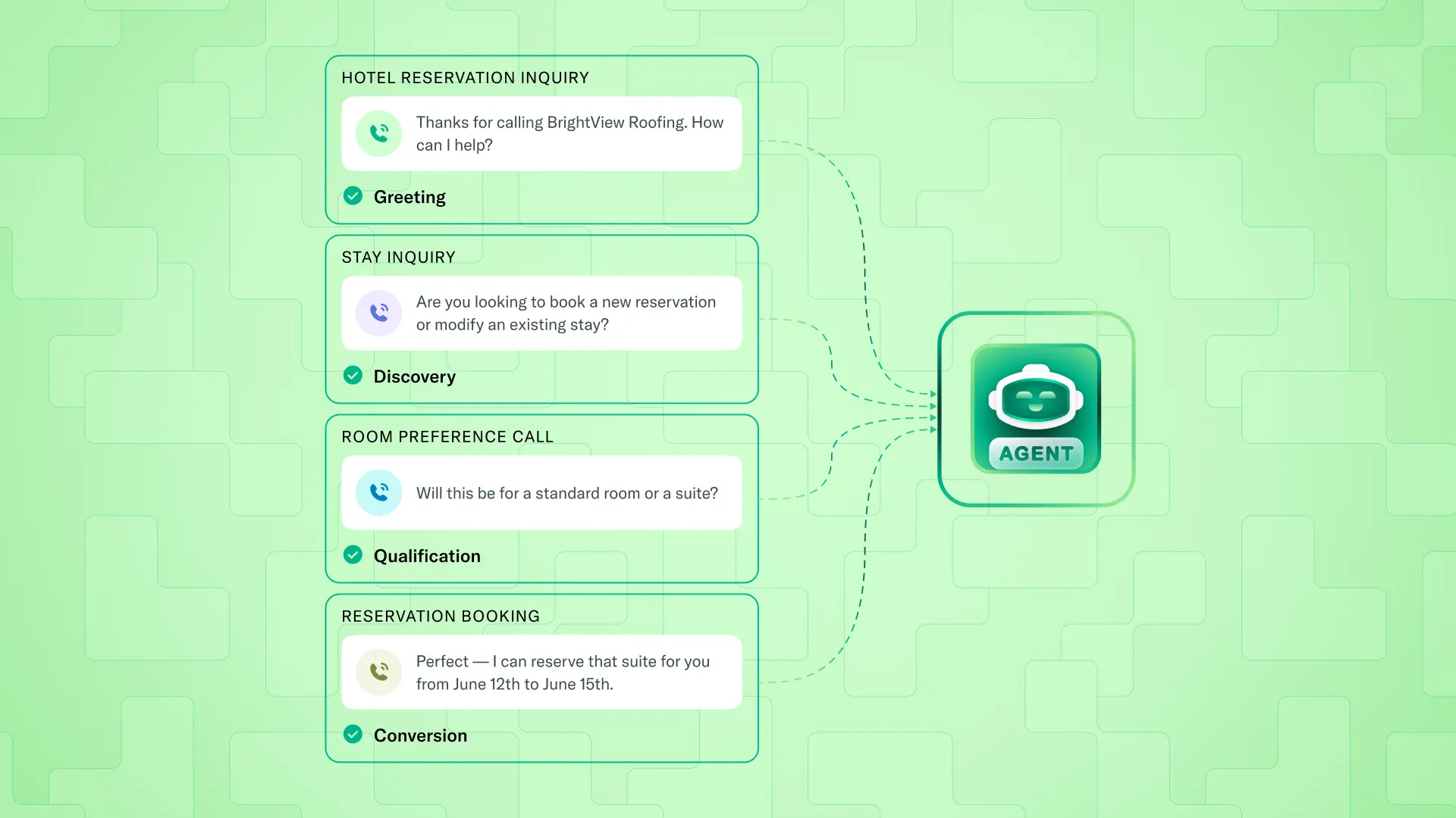 These actions are not predefined sequences. They are determined dynamically based on the interaction's state and the goal of moving it toward a successful outcome. This is what allows the system to operate reliably in real-world, high-variability scenarios.