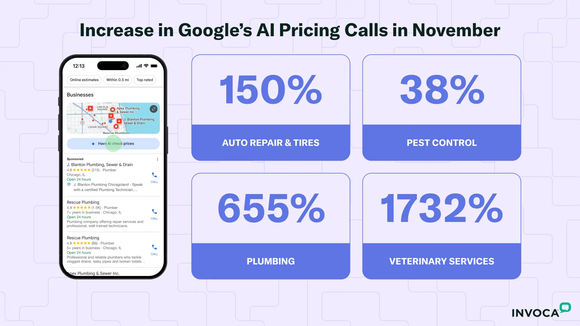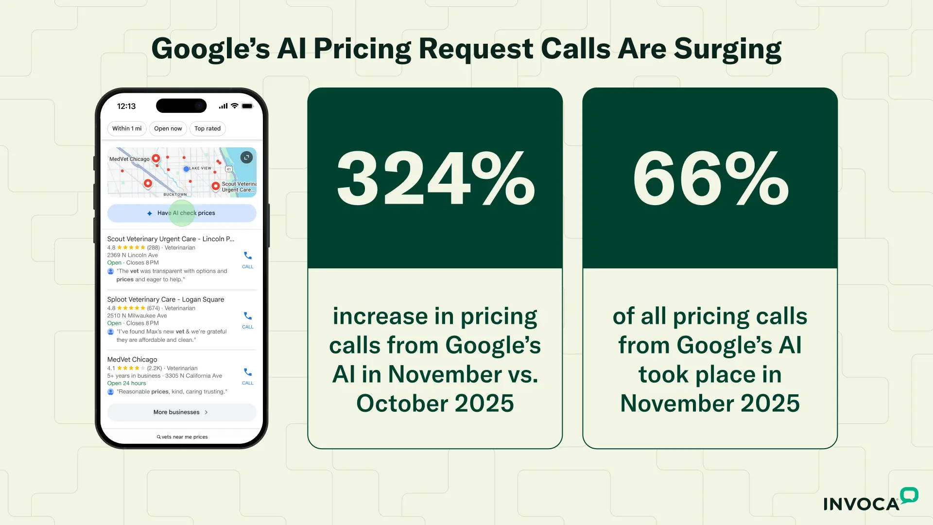 Invoca examined pricing request calls from Google’s AI from July 2025, when the feature was launched, through November. Calls in July through September were negligible, but volumes jumped 162% in October versus September and then another 324% in November versus October. 66% of all AI agent pricing calls from Google took place in November.