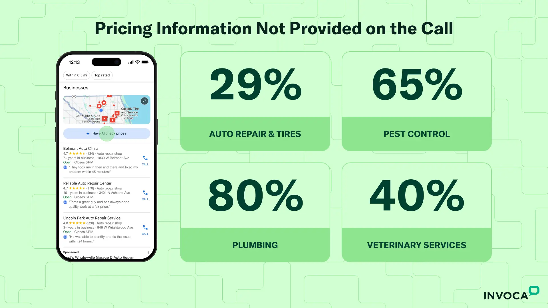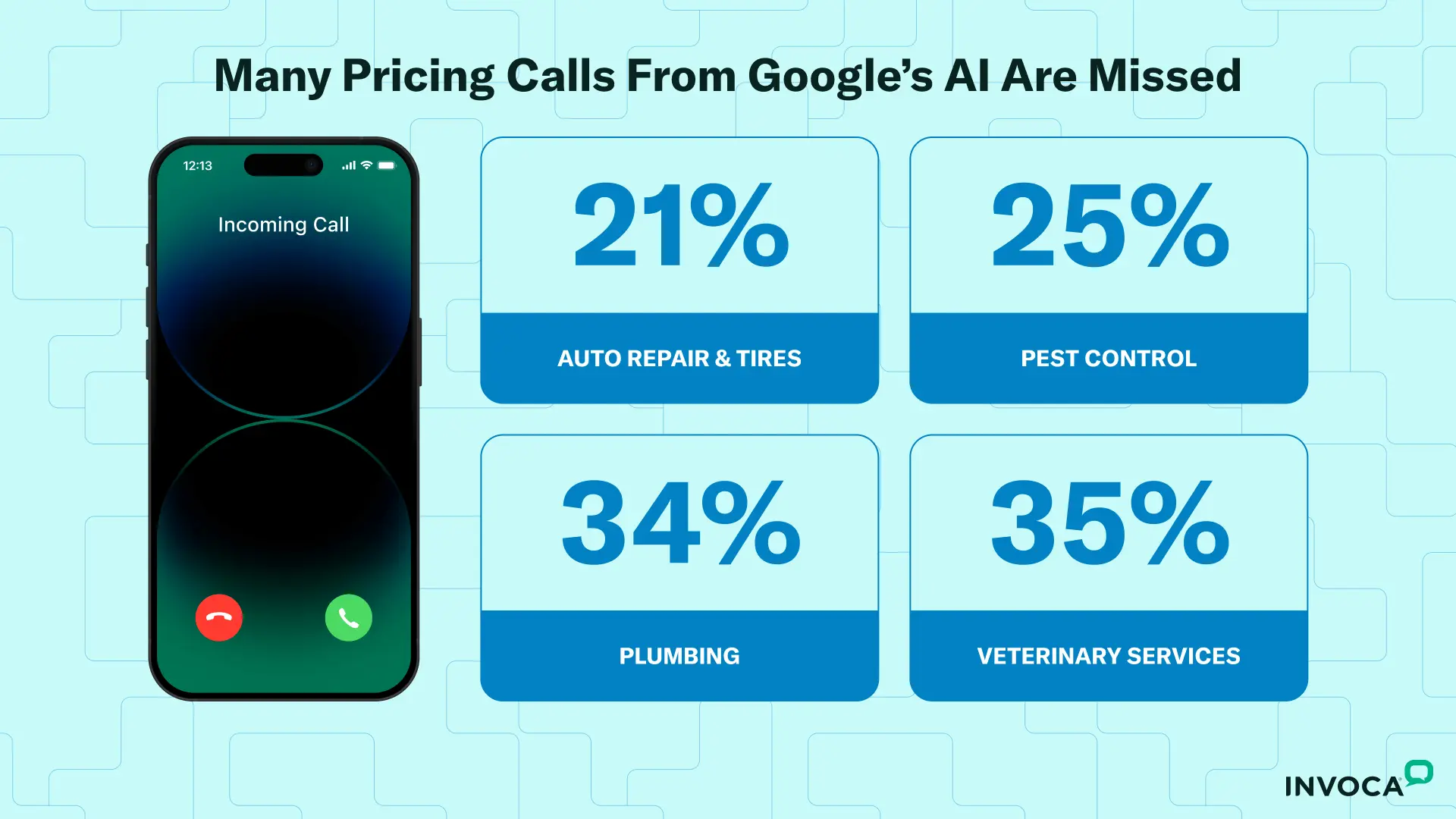 On average, 26% of pricing calls from Google’s AI aren’t answered by locations. Auto repair and tire providers and pest control businesses answer these calls at the highest rates (79% and 75%, respectively), with plumbing and veterinary businesses lagging behind (answering 66% and 65% of calls, respectively).