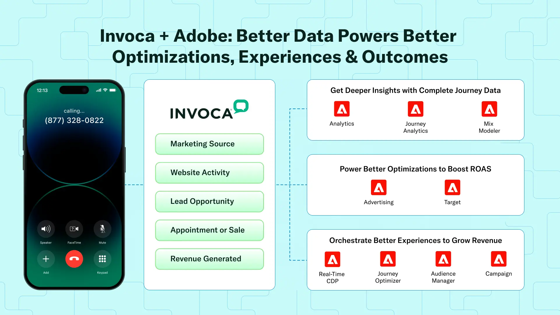 With Invoca, every offline experience and AI agent conversation is powered by the complete buyer journey: the campaigns and ads that drove demand, the pages visited, and the intent signals generated at every step. And because Invoca analyses every interaction and feeds their outcomes into Adobe and your other platforms, marketers can continuously optimise both their paid media investments and lead conversion rates.