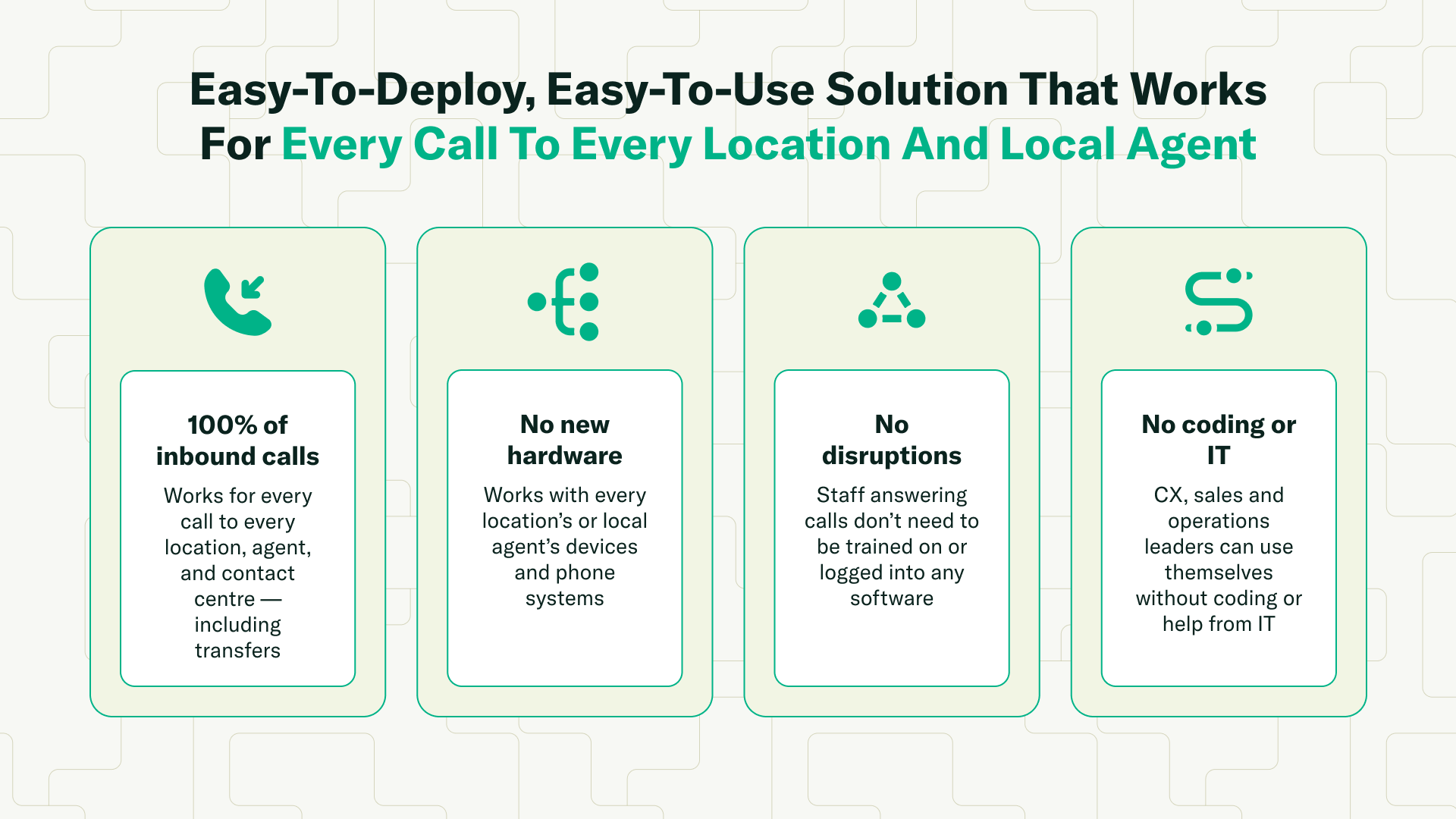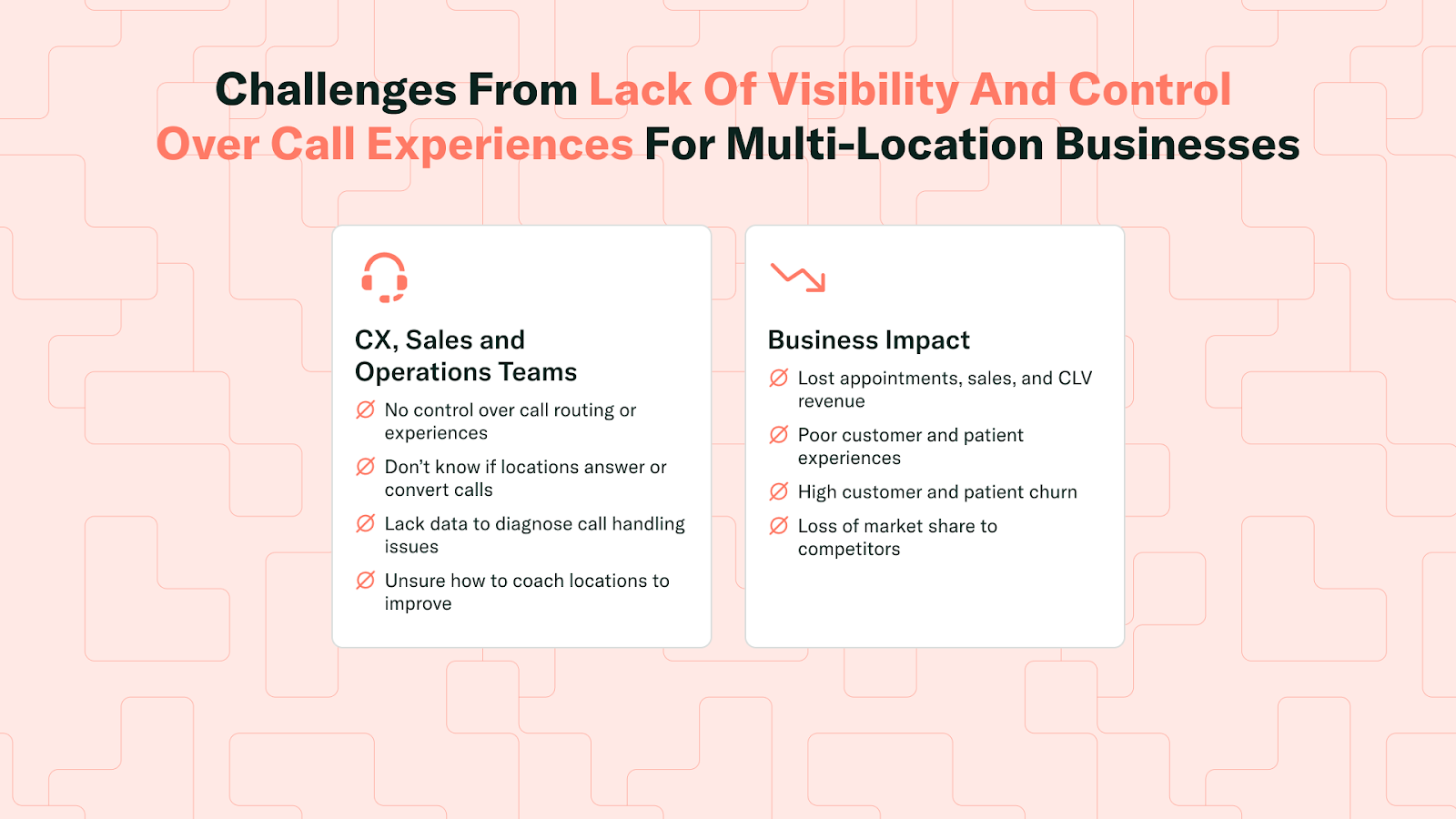 Multi-location brands struggle to centrally track and manage the billions of annual calls that go to brick-and-mortar locations and local agents. Locations, franchisees, and agents often operate in silos without national oversight, resulting in inconsistent performance, CX issues, and lost customers, patients, and revenue.