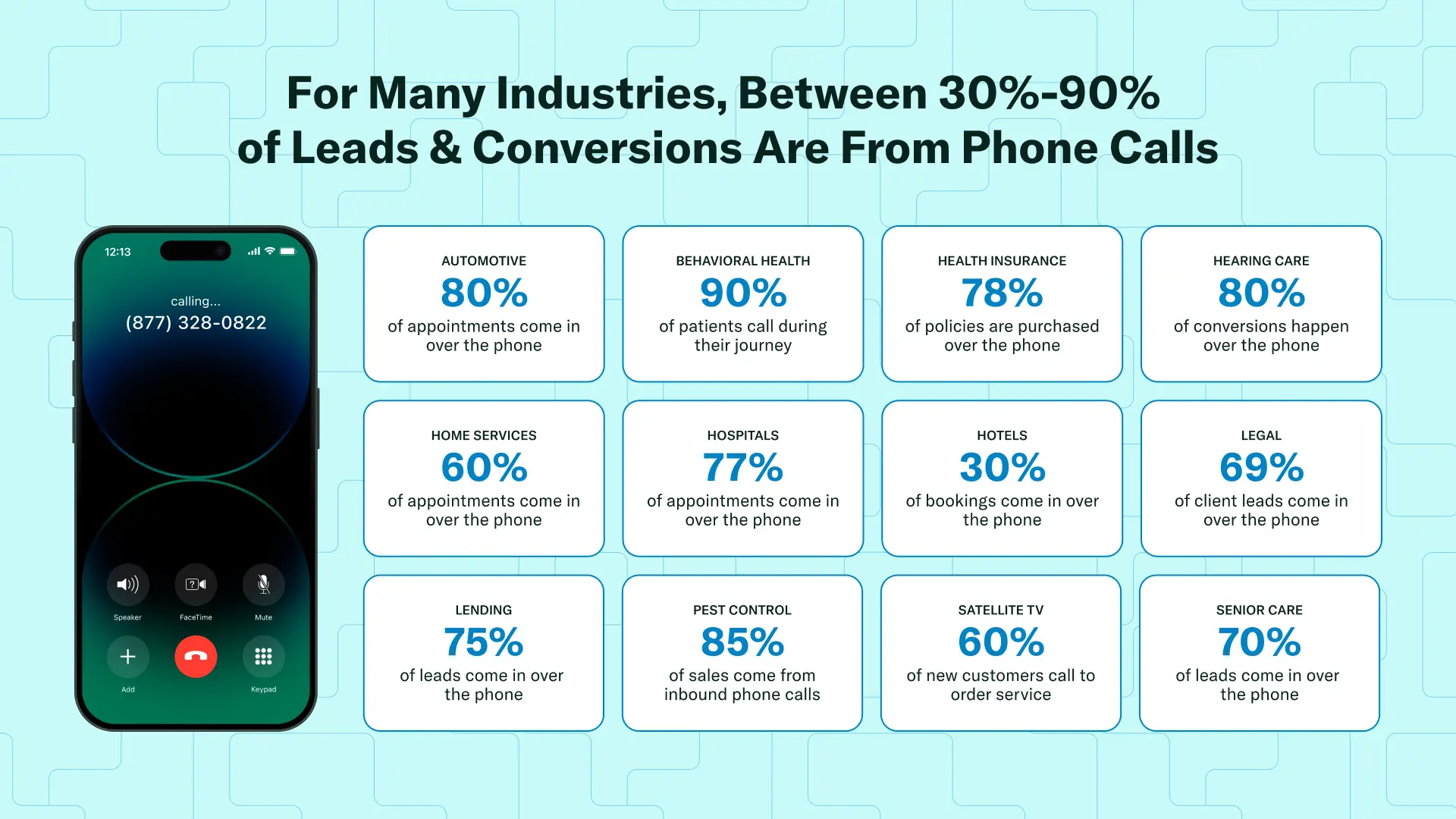 For businesses across many industries, the majority of leads and conversions come in over the phone. From automotive to healthcare, and from home services to insurance, a significant percentage of customers and patients call to get quotes, book appointments, and make purchase decisions.