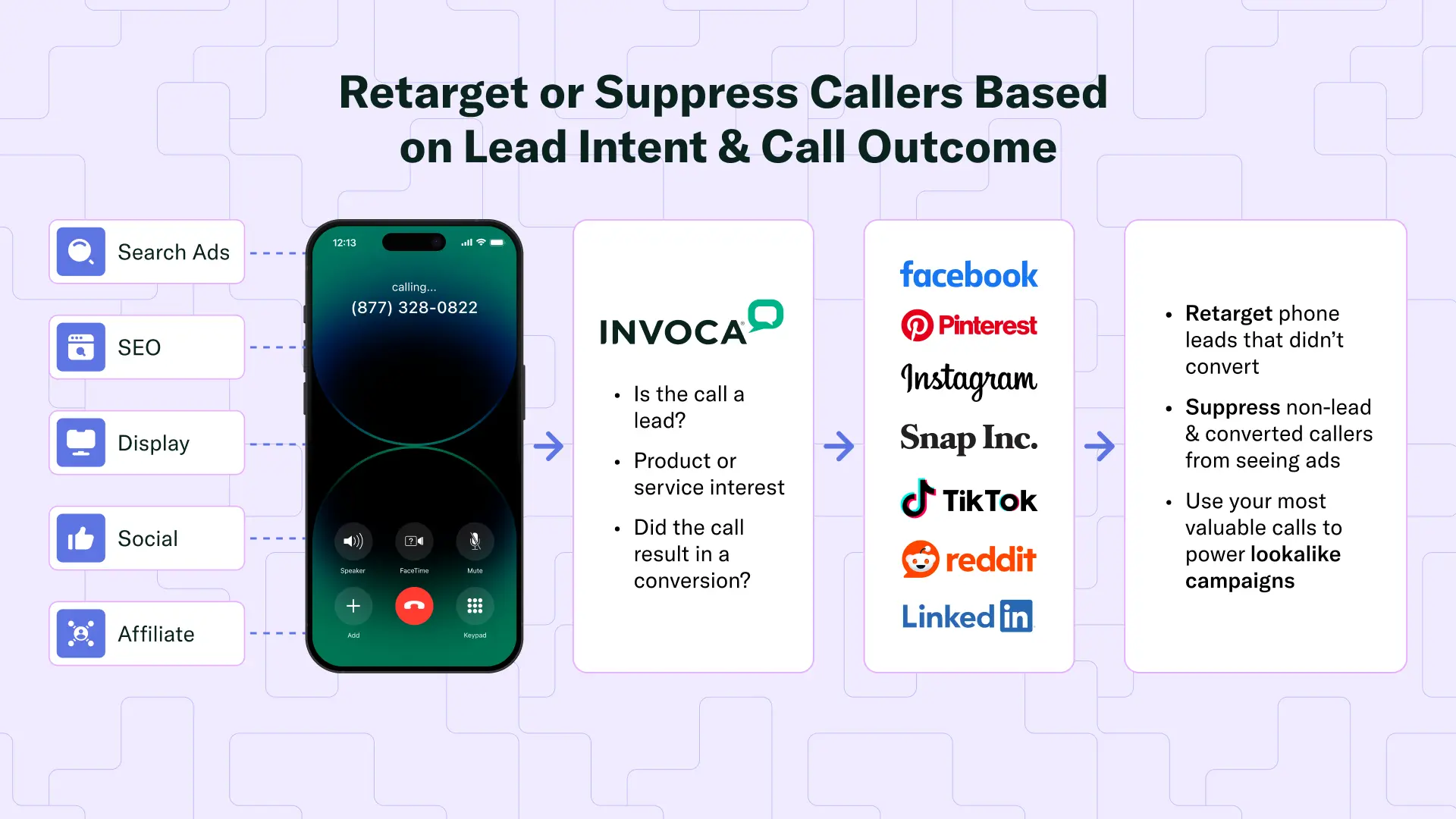 Targeting the right audiences on Reddit, Instagram, and other social advertising platforms can feel like a guessing game. First-party data from calls to your business can take the mystery out of each consumer’s intent and help you get the right ads in front of the right audiences, and away from the wrong ones. Invoca’s AI makes it easy to unlock that data from calls and activate it in the tools you use to build audiences.